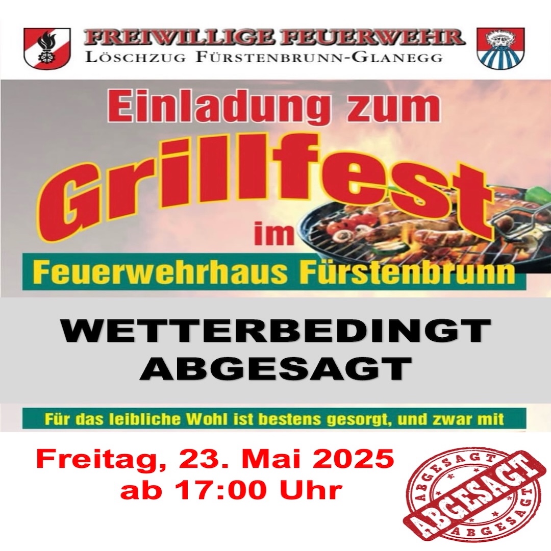 Das Grillfest am 23.05.25 der Feuerwehr Fürstenbrunn-Glanegg wurde wetterbedingt abgesagt. Schade, aber die Sicherheit geht natürlich vor. Wir hoffen, euch beim nächsten Mal wieder begrüßen zu dürfen!